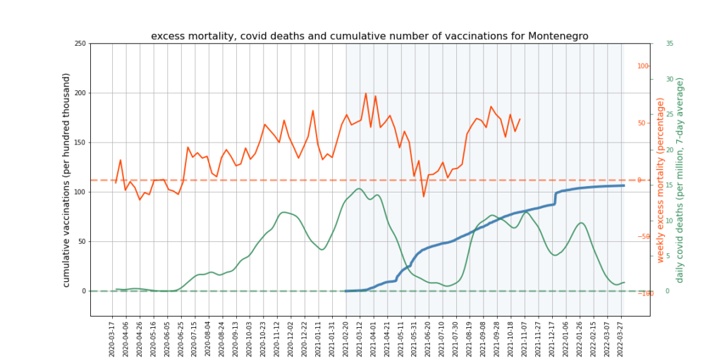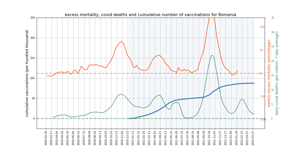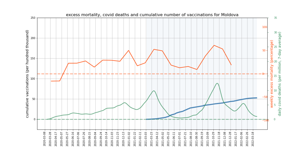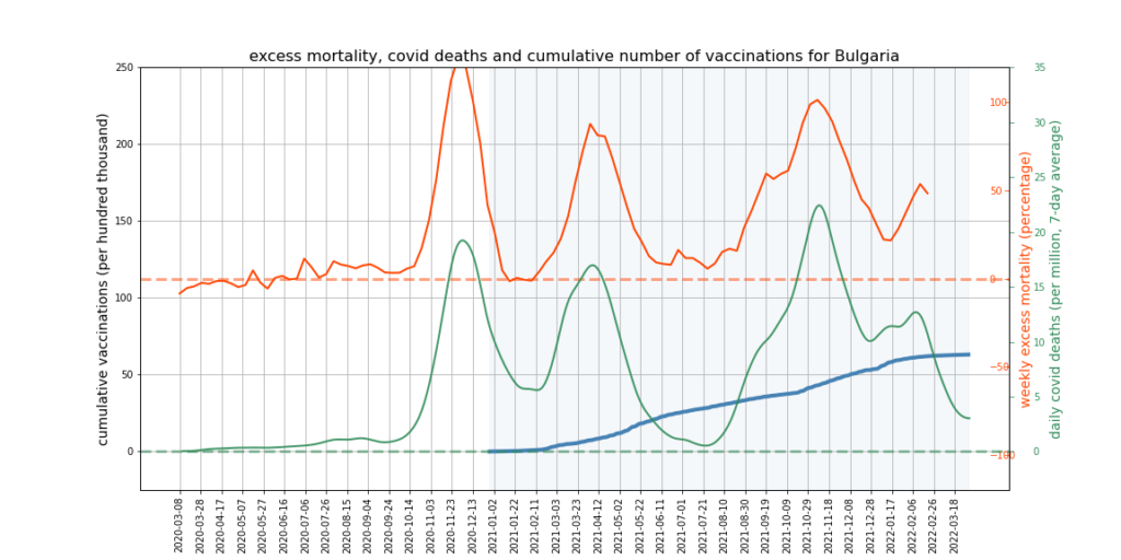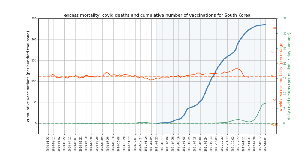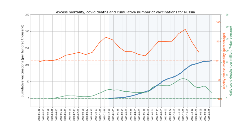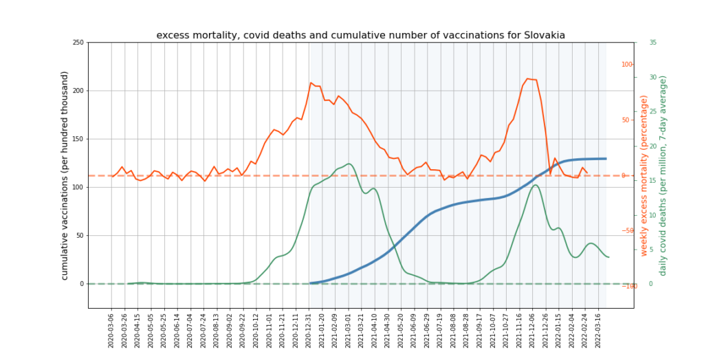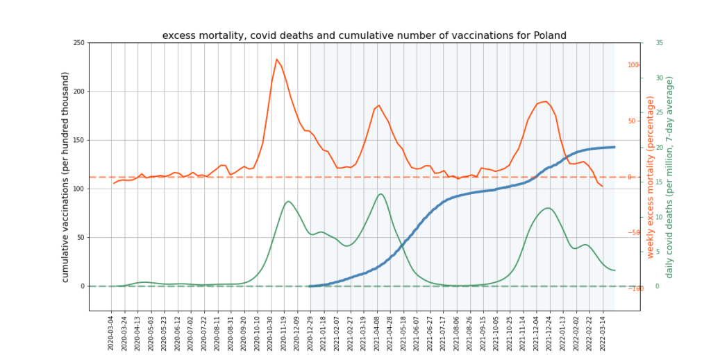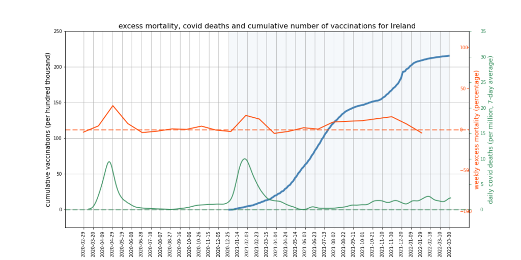 The graphs below show Covid deaths, excess deaths and vaccine doses for 42 countries, mostly in Europe but also Australia, New Zealand and Israel. In many of them a broad rising trend in excess deaths is discernible since the vaccine rollout began, with some more pronounced than others. The large impact of Covid waves and mortality displacement is also clearly visible. In many of the countries, the rollout (particularly to the elderly) was done during the winter 2020-21 Covid wave, obscuring a potential vaccine injury signal, and the subsequent mortality displacement has a similar effect. In Australia and New Zealand, the very mild winter ‘flu season’ (when flu was not around) during the rollout in 2021 resulted in low excess deaths in some of the colder months such as September, also obscuring a possible signal – though notably the winter months of June and July and, in New Zealand, August did not have the low mortality you would expect in a winter without flu. In the northern hemisphere, excess mortality in the winter just past was depressed by the mildness of Omicron, again obscuring a possible signal.