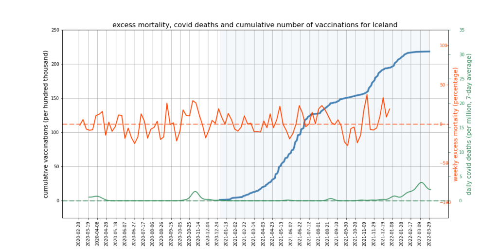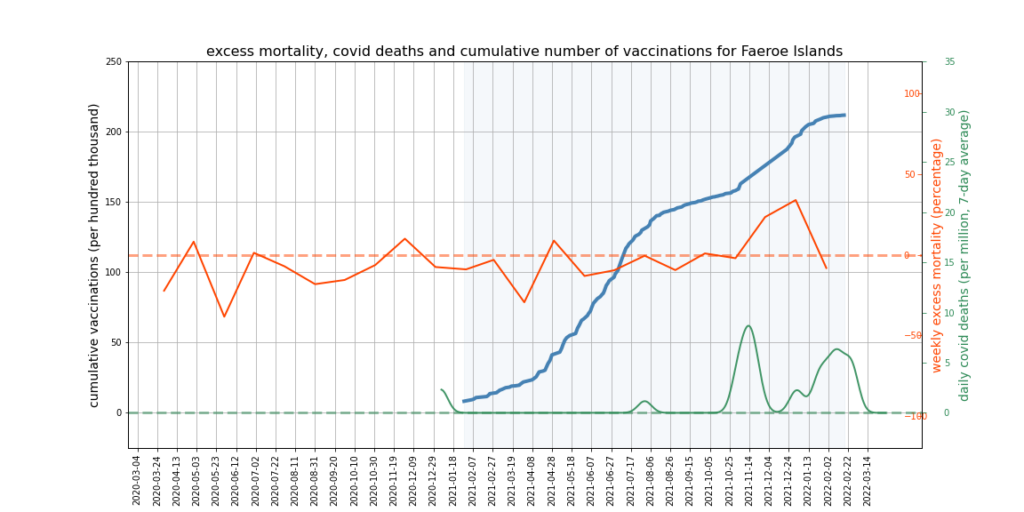 As it happens, the Faroe Islands does show a slight increasing trend of excess mortality since the vaccine rollout began (see below). However, it’s not what you could call an unmistakable signal.
