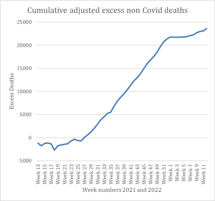 When both of these actions have been taken, the chart of the non-Covid excess mortality data (below) shows more than 23,000 excess deaths occurring during the study period, which is broadly in line with the number of vaccine injury deaths estimated by Will.