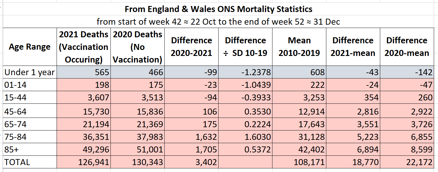 I’ve been recording and analysing the ONS all cause mortality figures since April 2020. The ONS gives weekly mortality figures broken down by age and separately by region week by week since 2010. I take five week window around each week/age range and week/region combination for the period 2010-9. I then take the mean and S.D. of this. Nothing fancy here, just what Excel provides me with. I then compare this with the equivalent weeks in 2020, 2021 and 2022, I use these comparisons to establish anomolies in the all cause mortality. Looking at anomalies in 2020, there are four distinct periods. 1) Normality before the first wave. 2) The carnnage that was the 1st wave. 3) Low mortality before the 2nd wave 4) The 2nd wave up to the end of 2020. As a model of whether vaccines are safe and effective I then have looked at periods 3 and 4. Period 3, weeks 25 to 41 was a time when Covid was circulating in 2020 but there was no surge in deaths. So my reasoing is that if the vaccines are safe the mortality in the equivalent period should be a bit less than 2020 and hopefully, roughly… Read more »