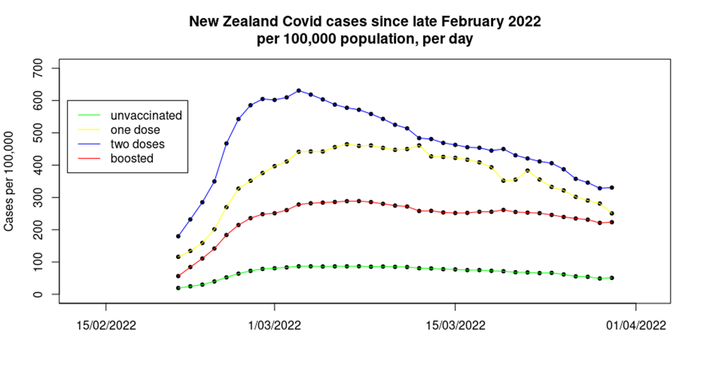New Zealand is somewhat helpful in that it does publish daily cases, hospitalisations and deaths by vaccine status; somewhat because it doesn’t allow easy access to anything other than the current day’s report. Thankfully, the Wayback Machine ensures that at least some web pages aren’t forever lost to history. These data were collated for dates since mid February 2022 and smoothed with a seven-day moving average to create a time series of Covid cases by vaccine status.