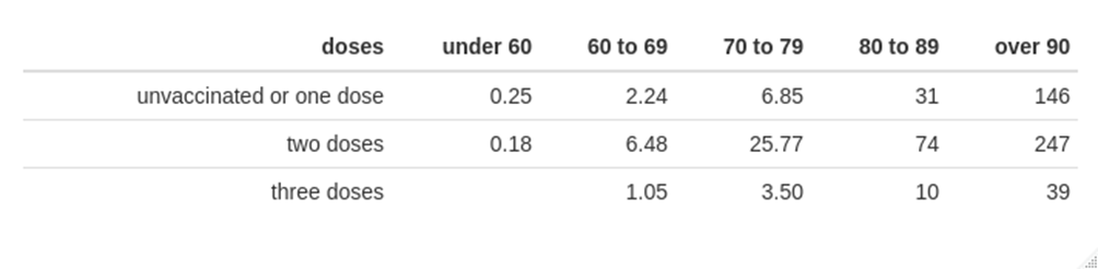 However, it is possible that New Zealand’s data have a similar pattern to that seen in the U.K. (and elsewhere), where dose effects are complicated by the health of those given each vaccine, namely that those closest to death were spared a dose of vaccine, and thus concentrated deaths into the very small number left in the prior dose group. A comparison of the data for ‘unvaccinated or one dose’ with ‘two or three doses’ suggests that the vaccines do still protect against death, but only to a very low degree in younger age groups.