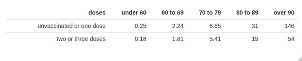 The above table suggests that while those given three doses of vaccine have a decreased risk of death from (or with) Covid compared with the mortality rate in the strange group called ‘unvaccinated or one dose’, the risk of death is greatest in those given two doses of vaccine.