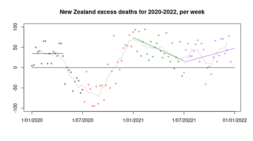 Perhaps the most interesting data in the graph above are seen in 2021. During the first half of 2021 excess deaths slowly reduced from the high seen at the start of 2021 (green data points), perhaps a result of healthcare provision returning to normal. However, around mid-year the trend reversed and excess deaths started to climb again (purple data points). Again, it must be pointed out that there were very few Covid cases in New Zealand at this time, and negligible deaths. Just about the only unusual things occurring in the country at that time were a lack of international travel, restrictions in day-to-day activities for the population and an enormous mass vaccination campaign using novel, under-tested vaccines.