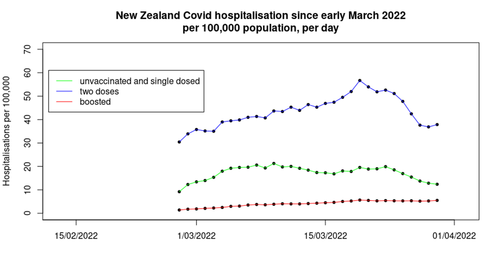- Hospitalisations in the boosted population appear to show little signs of slowing down, let alone reducing, over the period in question. Note also that this group saw a fourfold increase over the time period shown, whereas the double dose and single-dose/unvaccinated group both saw a 25% increase, albeit with an intermediate period with higher hospitalisation rates.