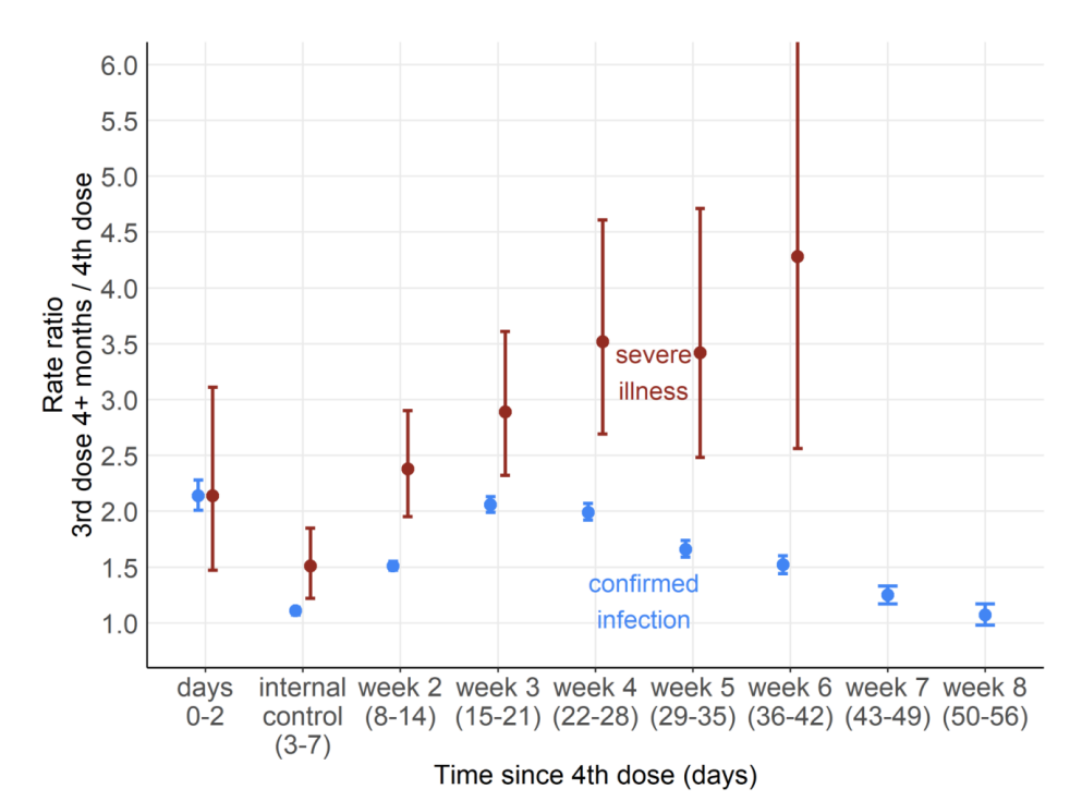They compared infection rates and severe cases in the four-dose group to the three-dose group, and also to an “internal control” in the form of the four-dose group in the first week after the jab (excluding the first two days). They provided estimates of rate ratios (a measure of vaccine effectiveness) adjusted for age, sex, demographic group, and calendar day (to take into account the varying prevalence over the epidemic wave).