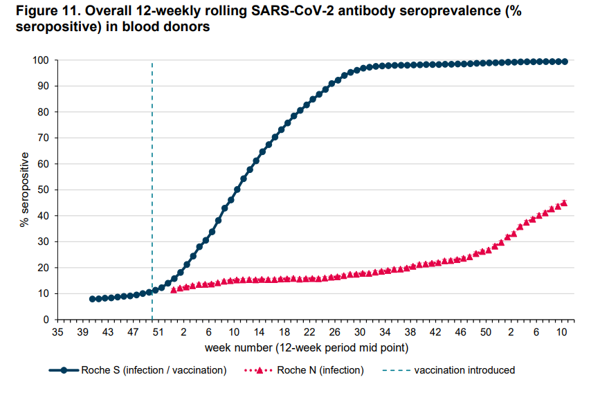 Below is the latest graph from the UKHSA showing how antibody levels in blood donors in England have changed since autumn 2020.