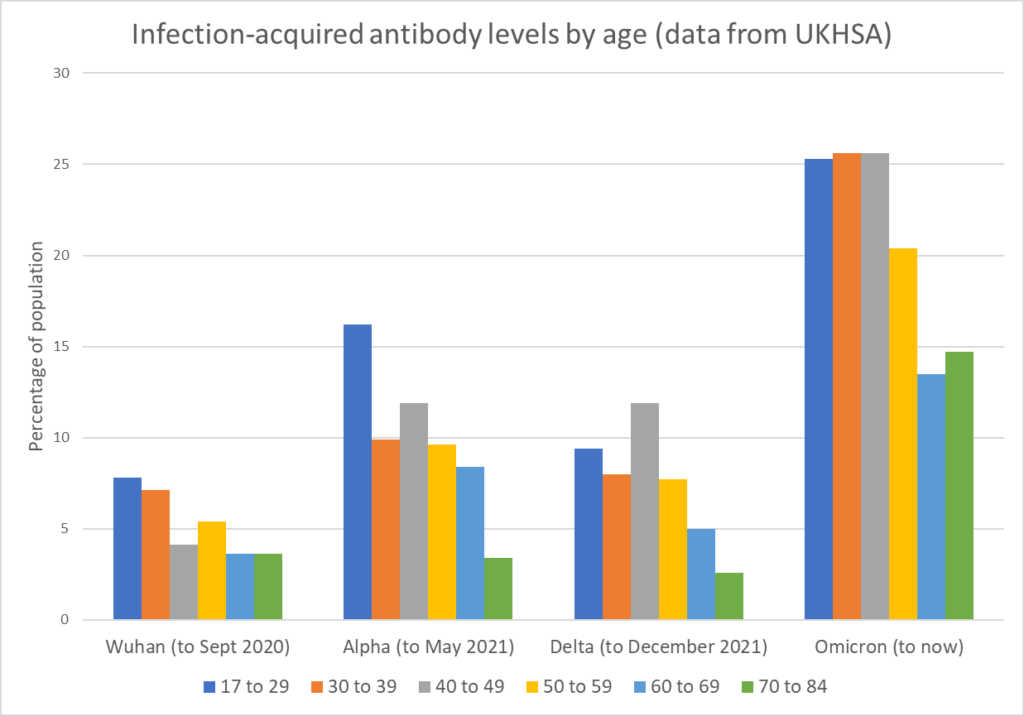 From this and earlier UKHSA/PHE reports we can infer that the first wave infected around 5.7% of the population (though data from this period is mixed, with some showing up to 8.3%), the Alpha wave infected around 9.9% (perhaps a bit less if you use a higher first wave estimate – either way the first two waves together infected around 16%), the Delta wave infected around 8% and the Omicron wave has infected around 21.4% (so far). On these data, around 45% of the country have now been infected at least once at some point during the four Covid waves. Note this doesn’t allow for any waning of infection-acquired antibodies, which would mean these are lower-bound estimates.
