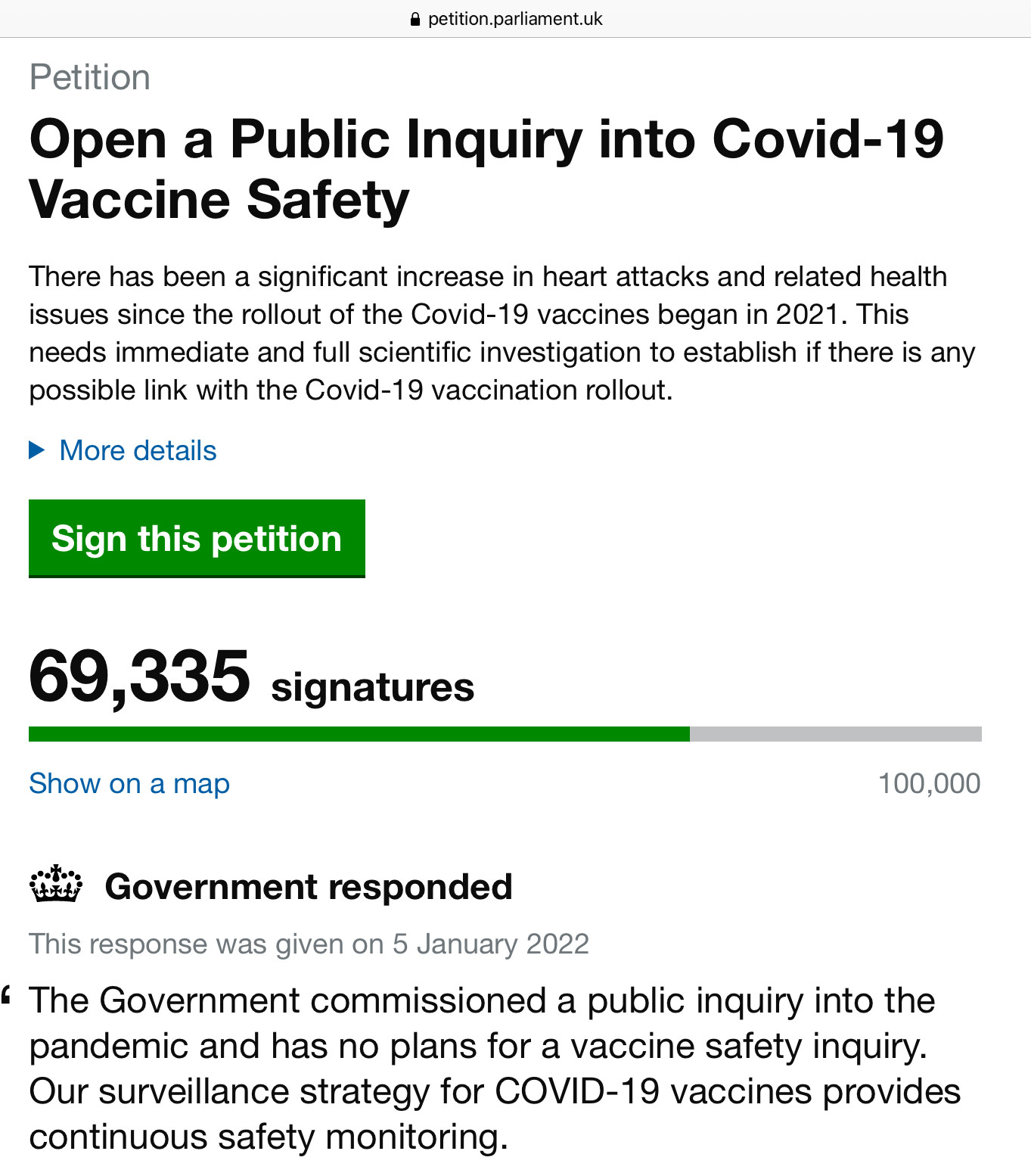 Interesting response from the Government in their shorter January 2022 response to this petition. I quote “The benefits of the vaccines in preventing COVID-19 and serious complications associated with COVID-19 continue to far outweigh the risks in the majority of patients.”