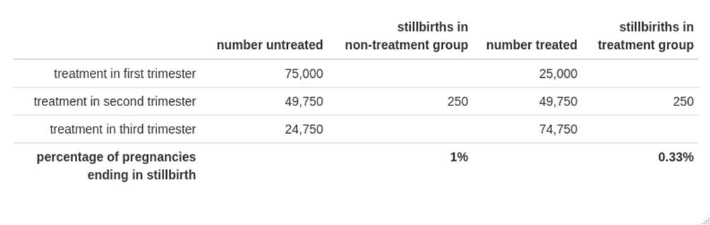 The problem is, during a vaccination campaign, you have to consider that at least some of those women that have tragically suffered a stillbirth didn’t get a chance to get vaccinated later in their pregnancy. This effect is perhaps complex, but it can be illustrated using a simple example. Consider a population of 100,000 women that get pregnant all at once (perhaps after the screening of a particularly engaging movie about cute babies) with a stillbirth rate of 0.5% in the second trimester of pregnancy (specifically), and where one quarter get a medical treatment during their first trimester, one quarter during the second trimester, one quarter during the third trimester and one quarter were still untreated at the end of their pregnancy. Let’s examine how these illustrative pregnancies would proceed.