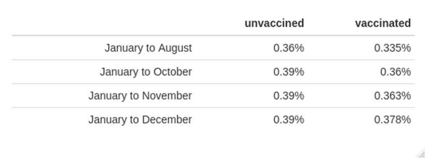 Note in particular that the final month’s rate for the vaccinated is substantially greater than that in the unvaccinated for the same month, even though the average over the 12 month period remains below the unvaccinated rate – such are the complications of working with cumulative percentages.