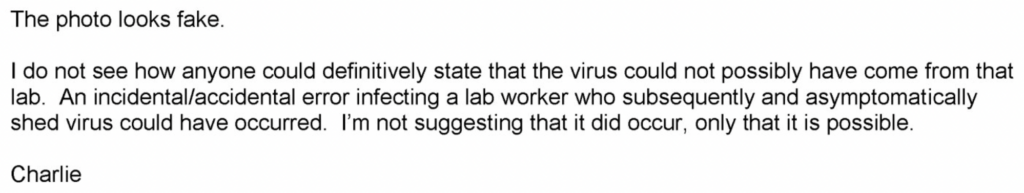 Interestingly, Calisher’s email was sent one month after the Lancet letter’s publication, which means he either changed his mind or was not expressing his true beliefs when he co-signed the letter.