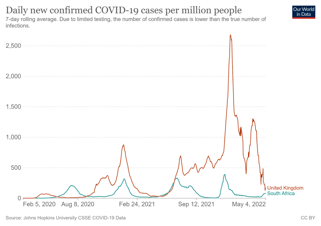 South Africa never lifted its mask mandate and, though the mandate was due to end this week, has now extended it. It never lifted it despite the country skipping the Omicron BA.2 wave and having low infection levels for months, its original Omicron wave being much smaller than in other countries (see below) and the variant anyway being considerably milder and posing no threat.