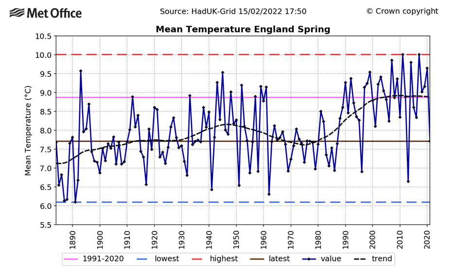 In fact, spring in England is no warmer than 20 years ago. Despite a rise in the 1990s, the temperature is no higher than the 30-year average. Yet another ‘pause’ makes an appearance in the temperature record.