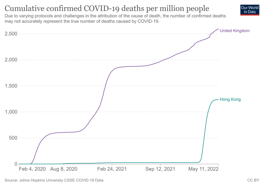 It is true that Hong Kong had a nasty March. However, the scale shouldn’t be exaggerated. Hong Kong’s Omicron wave was almost identical to the U.K.’s 2020-21 winter Alpha wave – the U.K. suffered 1,240 deaths per million against Hong Kong’s 1,210. It is curious that for Hong Kong the deadly wave occurred with the Omicron variant, which has been mostly mild elsewhere, but that oddity doesn’t change the overall numbers. The U.K.’s ICUs were not overwhelmed during the winter of 2020-21, though it was extremely busy.