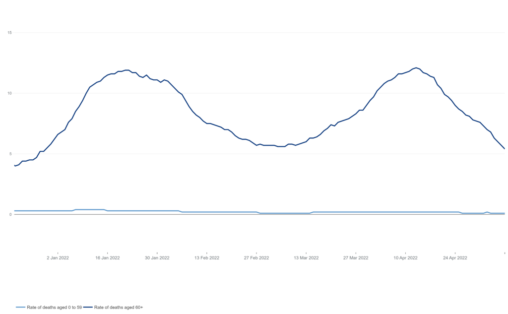 Despite this huge difference in prevalence in the most vulnerable age groups between the two waves – in the 70-plus age group, BA.2 was around two and half times more prevalent than BA.1 – the number of deaths in the two waves has been similar, peaking around the same level and with slightly fewer deaths overall in the BA.2 wave.