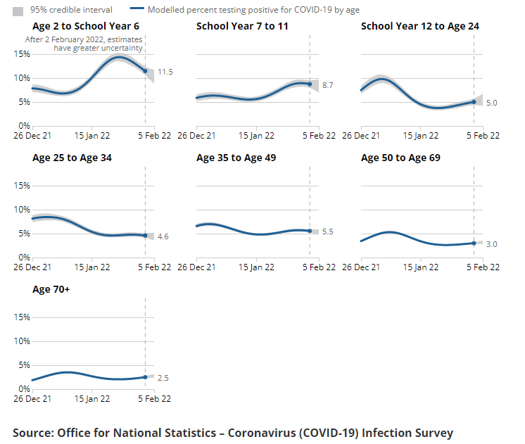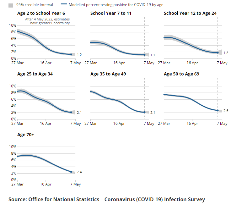 The breakdown by age shows an interesting contrast between Omicron BA.1 and BA.2 waves. BA.2 spread broadly throughout the age groups, and unusually for Covid had higher prevalence in older people than younger.