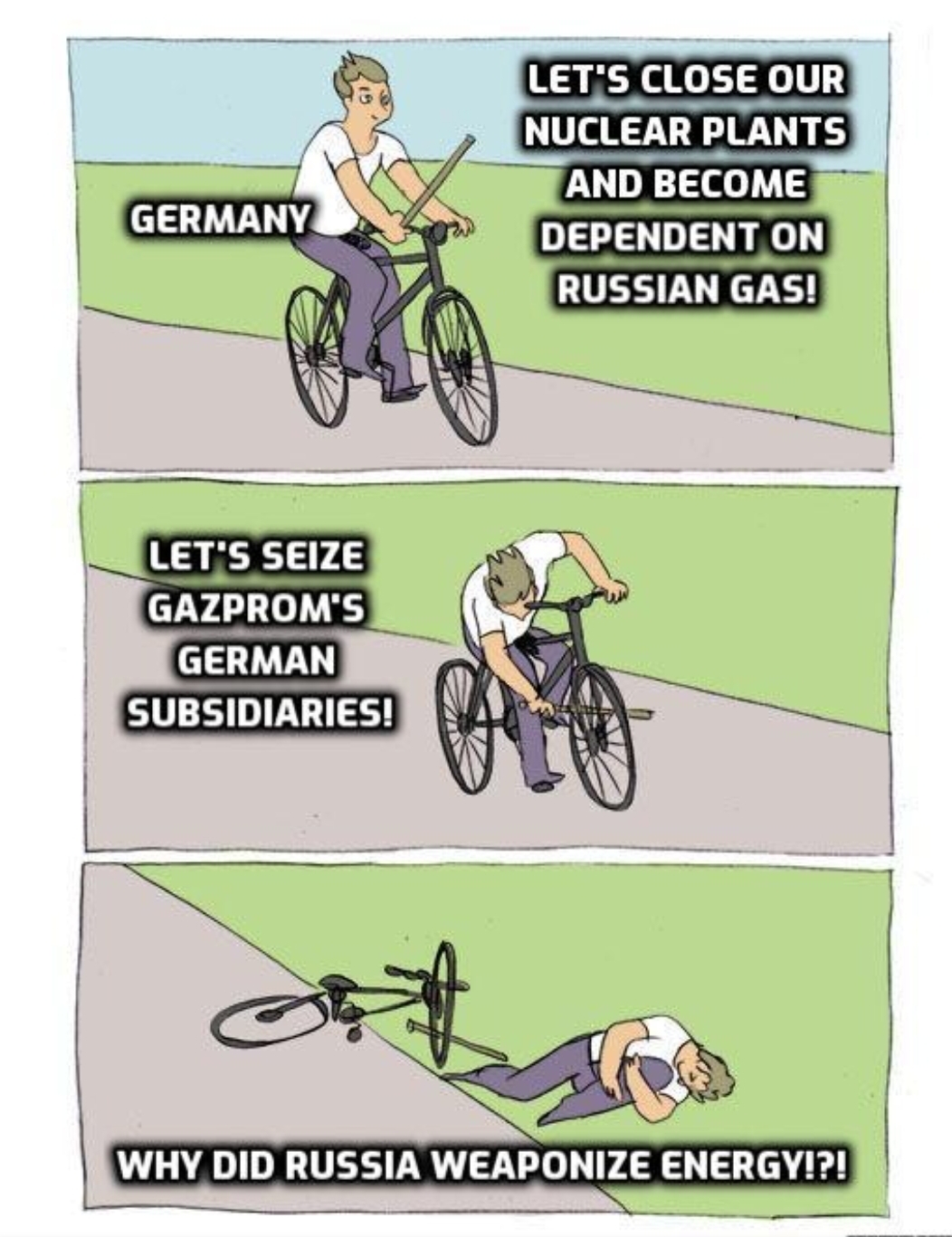Germany is on an implosive self-destruct path – self loathing for being German appears to have finally driven them over the edge. Their best option would be to hand the country over as an un-named ‘territory’ to be exploited by the CIA and the Pentagon as they see fit and just leave it at that. “Finis Germania’ ,as a German Philosopher, Rolf Peter Sieferle reluctantly concluded just a couple of years ago. is the result of enduring guilt and self-loathing of te very idea of German nation following the Holocaust The composition of the current wokist, feminist, greenist Leftist “Government” “would have been a bad political joke just 20 years ago! How ironic that they are backing Ukraine Azov militia, who wave Nazi flags, wear their emblems and advocate and practice “ethnic cleansing” of Russian speakers ! It looks like they have been ‘elected’ to wrap everything up, sell off the stock and close the shop to both ‘save the planet’ and help Ukraine destroy Russia for the CIA.. Can’t understand what the FDP is doing mixing with such bizarre company- anything for a sniff of power I suppose. Th AFD is the only party at all interested in retaining… Read more »