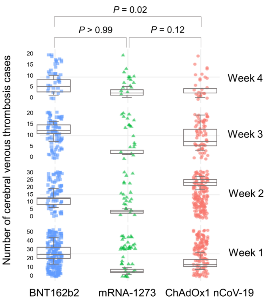 The researchers take into account under-reporting to produce estimates of increased risk above a baseline: around 3.5 times greater risk for mRNA vaccines and seven times greater risk for AstraZeneca. This means the CVT risk from mRNA vaccines, while high, is around half that of AstraZeneca.