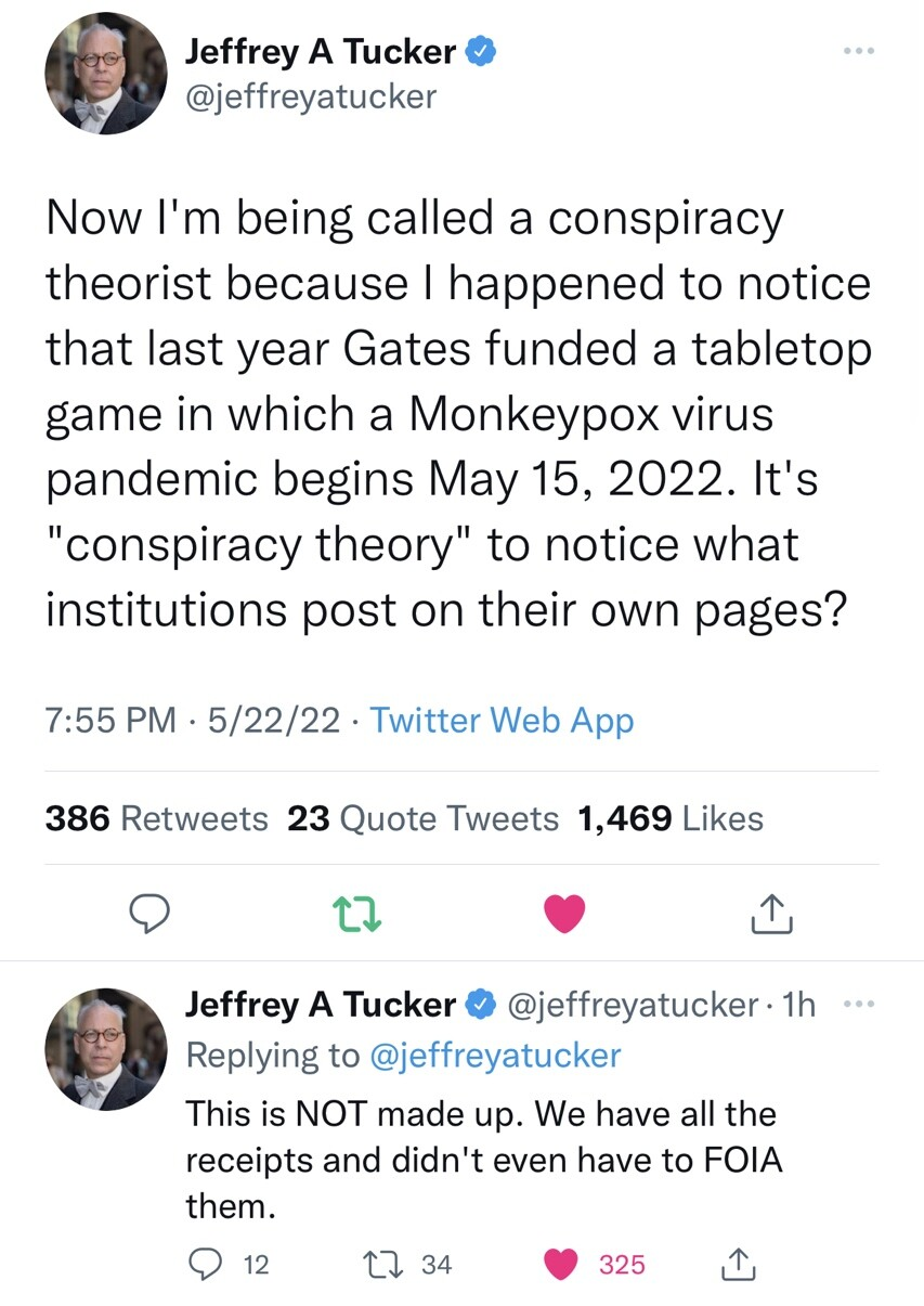 - “Prof. Neil Ferguson of Imperial College London predicts two billion dead by next Tuesday from monkeypox unless we pass the WHO Treaty and give global control to China and Bill Gates” – Tweet from the World Ecommunist Forum that is, hopefully, satire and not prophecy.