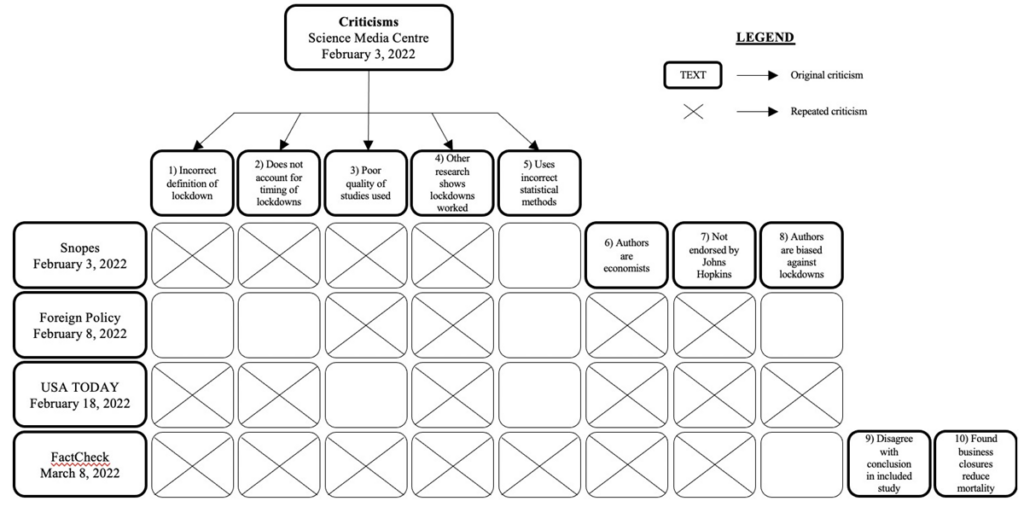 The accompanying Figure 20 denotes five of the most scientific criticisms raised in Science Media Centre as well as five criticisms raised by follow-up ‘fact checkers’. Although we believe that the criticisms are with little or no merit, we are not going to engage in a critique of them in this Appendix, as the relevant criticisms are dealt with, either directly or indirectly, in the text of this working paper. Our purpose is to illustrate how biased and politicised the media was when it came to its reportage of our working paper.