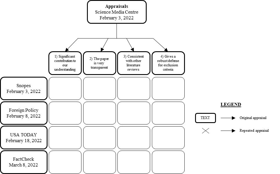 There was, of course, a great deal of reportage about our working paper that appeared in the early February-April 2022 period. This material was highly repetitive, echoing material presented on February 3rd in either the Science Media Centre press release or the Snopes report. There were several similar reports, but to avoid repetition ourselves, we limit our review to the five reports contained in Figure 20.