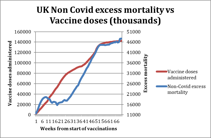 In summary, we find a high rate of excess non-Covid related mortality correlated to vaccination campaigns that needs to be thoroughly investigated. It cannot be ‘brushed under the carpet’ as just a peculiar anomaly in the U.K., as similar effects are seen in at least one other European country. This analysis, and its potential seriousness, are corroborated by the similarity in the mortality rate, at one every 4,000 doses.