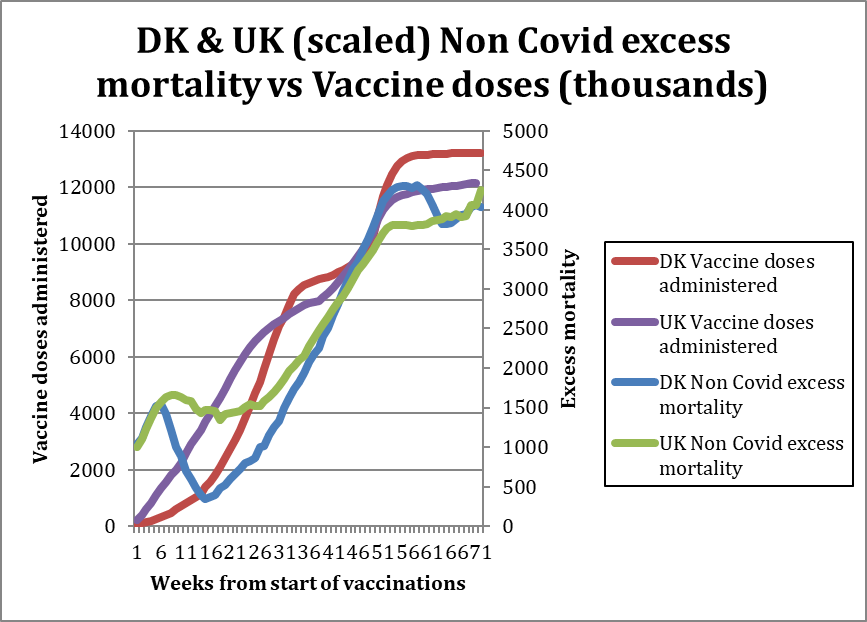 The Danish and U.K. figures (once adjusted and scaled) both show a rise from about 1,000 excess deaths at the start of the vaccination campaigns to about 4,000 excess deaths now. This is an increase of 3,000 deaths after approximately 12 million vaccine doses have been administered i.e., 0.025% or one every 4,000 doses.