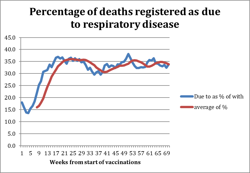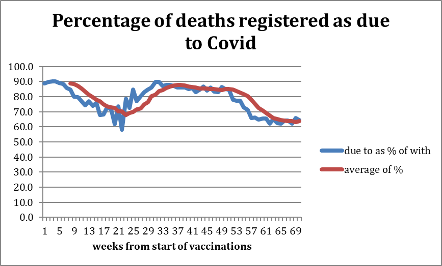 For comparison purposes, the equivalent ratio for ‘other respiratory diseases’ varies between only about 15% and 35% i.e., only 15-35% of deaths with a non-Covid respiratory disease are recorded as having that disease as underlying cause.