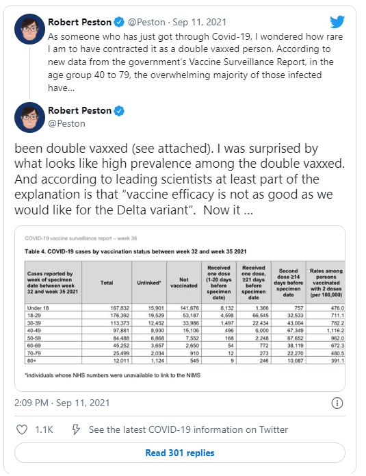 Let’s go back to the beginning and the furore caused by Robert Peston’s initial tweet that set this particular hare running. This was followed by an attempted takedown by Leo Benedictus of Full Fact after President Bolsanaro of Brazil quoted the same numbers and an article in the Guardian by Professor Sir David Spiegelhalter and Anthony Masters published on September 19th 2021. In addition, the BBC Radio 4 programme on More or Less covered the story on Sept 15th 2021, featuring a discussion between presenter Tim Harford and mathematician James Ward which concluded that the vaccines were very effective and that there was nothing to see here. The show also informed us that ITV had deleted the Peston tweet.