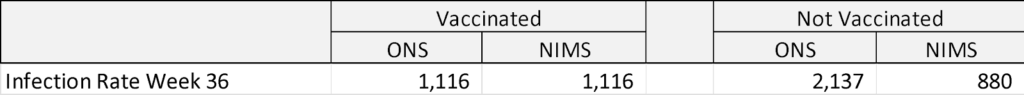 The infection rate in the vaccinated doesn’t change whether the NIMS or ONS data are used; it stays at 1,116 per 100,000. All the error is concentrated in the unvaccinated. From the figures above we can see that using NIMS data the infection rate goes from the reported 880 per 100,000 to 2,137 per 100,000, almost 2.5 times what was reported and almost two times the rate of the vaccinated. Simply put, the same number of infections are spread among a smaller group of people if we use the ONS population estimate.