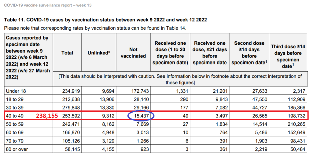 Let’s just remind ourselves that this table shows infections by vaccine status for the prior four weeks. You can see circled in blue that 15,437 of the infections in the 40-49 age cohort were amongst the unvaccinated, up 331 (2%) from the 15,106 amongst the unvaccinated back in September 2021. Whereas amongst the vaccinated there had been 238,155 infections (253,592 – 15,437). That’s 155,380 (187%) higher than in September 2021 (238,155 – 82,775) and, let’s not forget, in the meantime many of this age group had had a third vaccine dose. Isn’t that amazing, the rate of increase in infections was about 90 times greater in the vaccinated than the unvaccinated.