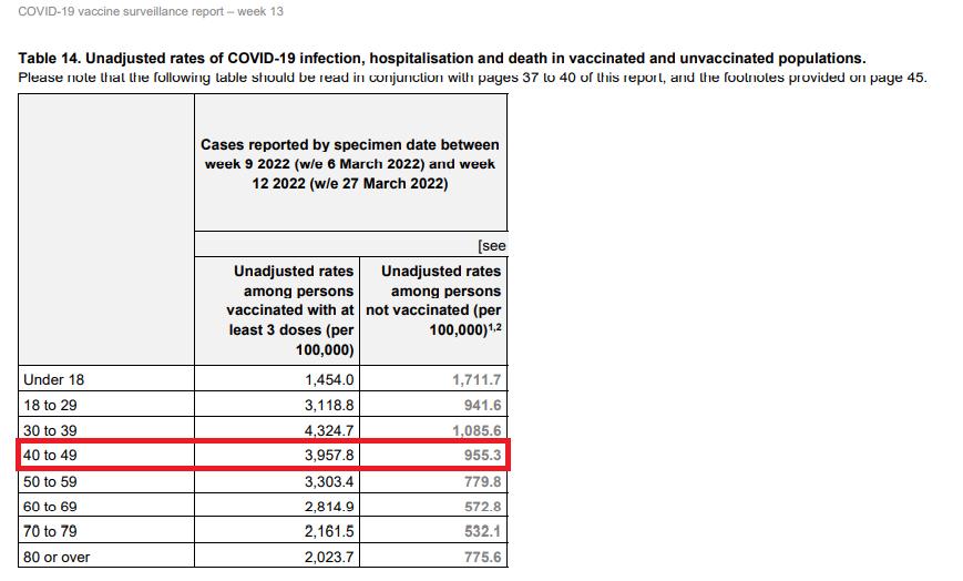 In the 29 weeks since the week 36 report, the vaccination rate amongst the 40-49 year-olds is much the same yet the incidence of infection in the triple-vaccinated has increased markedly.
