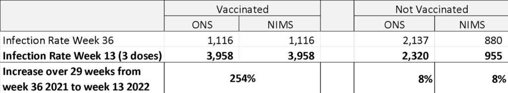 Just to nail the point, let’s also look at the change in infection rates per 100,000. The table below shows the infection rate in the triple vaccinated compared to the not-vaccinated from the week 13 2022 UKHSA vaccine surveillance report.
