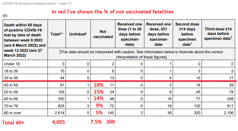 Table 7 is reproduced from the week 13 2022 UKHSA vaccine surveillance report. It shows the number of deaths by vaccine status by age cohort. These are raw figures, not deaths per 100,000. As you can see, among those aged over 40, 300 of the 4,005 deaths were of unvaccinated people, that’s 7.5%. Surely, if the vaccines were efficacious you’d expect the unvaccinated death rate to be higher than that of the vaccinated.