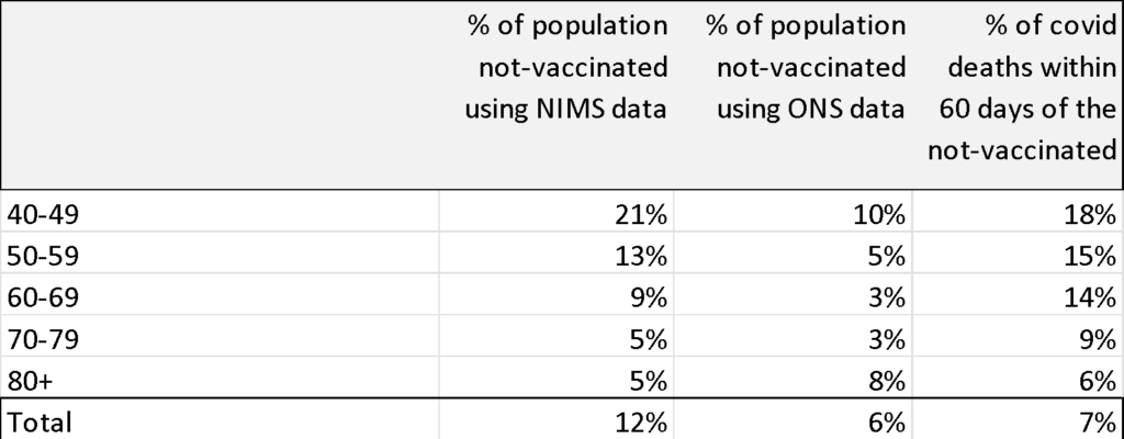 Below, I’ve shown the percentage of deaths against the percentage of those unvaccinated using both NIMS and ONS population data.