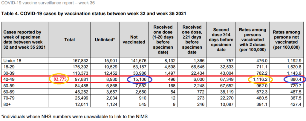 I’ve reproduced below the table from the UKHSA week 36 vaccine surveillance report, which was also shown in Peston’s original tweet. You can see the numbers quoted by Spiegelhalter for the infection rate by vaccine status per 100,000 in the last two columns circled in orange and blue and the raw number of infections by vaccine status in columns two and four. Of course, the number of infections in the vaccinated 40-49 year-olds is the total less the infections in the unvaccinated, 97,881 – 15,106 = 82,775.