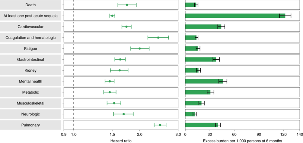 That’s a complicated graph, so a quick summary: On the left are ‘hazard ratios’, anything above 1.0 means that the study group (vaccinated infected) had more problems with their health (sequelae) than the control group (that didn’t get infected with Covid before or during the study period). For example, around about twice as many people in the vaccinated-infected group had problems with fatigue than in the control group (hazard ratio is about 2.0). On the right are the number of additional cases of each sub-type of sequelae that were seen, per 1,000 people – this is a very important aspect of the results, as it reflects the real-world impact of disease. The number of additional cases of ‘negative health conditions’ in the infected group was around 10-40 cases per 1,000 individuals for each sequelae category (i.e., an absolute increase in each category by around 1%-4%).