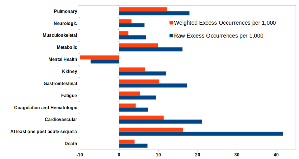 On the face of it that’s a rather scary graph – it suggests that around 12% of those infected with Covid after vaccination have at least one ‘probably serious health issue’ in the months following recovery. Note, however, that the individuals included in the analysis had to have ‘interacted’ with their healthcare provider at least once in the previous two years to be considered for inclusion in the study, so probably doesn’t include the most healthy individuals. I suggest that it is likely that individuals with mild symptoms (the majority of infections) would have lower incidence rates of these sequelae, but this wasn’t specifically addressed in the study.