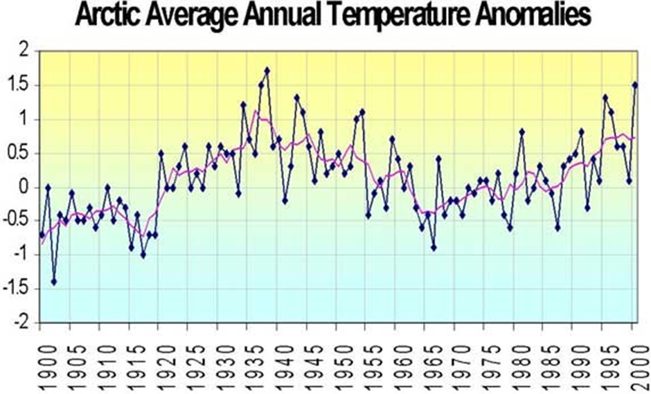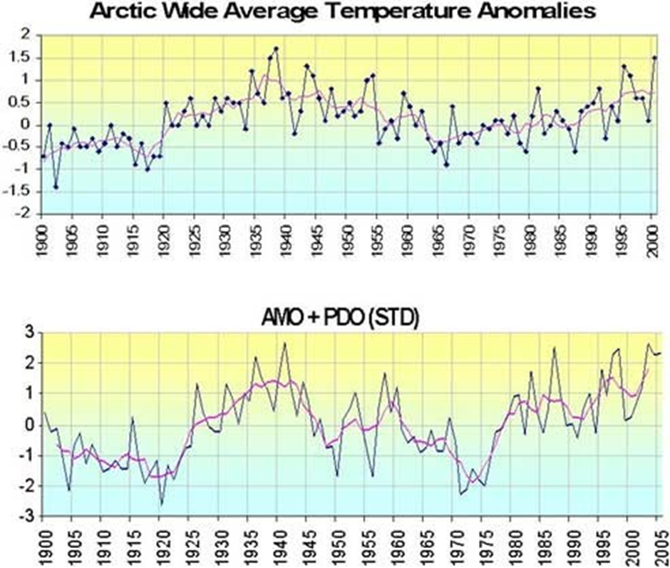 The lower graph tracks the warming and cooling for both the Atlantic and Pacific. It can be seen that when set against the Arctic temperature record, there are obvious links. As a result, many scientists argue that this evidence goes a long way to explain Arctic warming and cooling.
