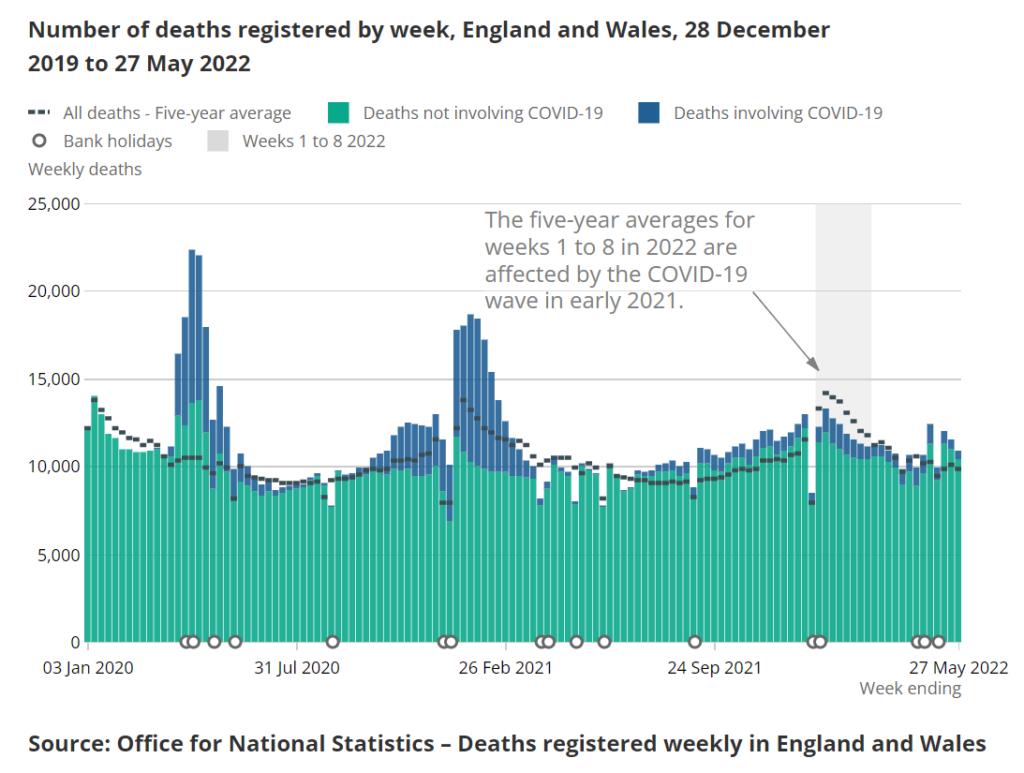 Having just reviewed this week’s report, I note that it does not have the whole UK figures: “Because of the bank holidays on 2 and 3 June, data processing has been delayed in Northern Ireland, so mortality figures for the UK in the week ending 27 May are not available.”