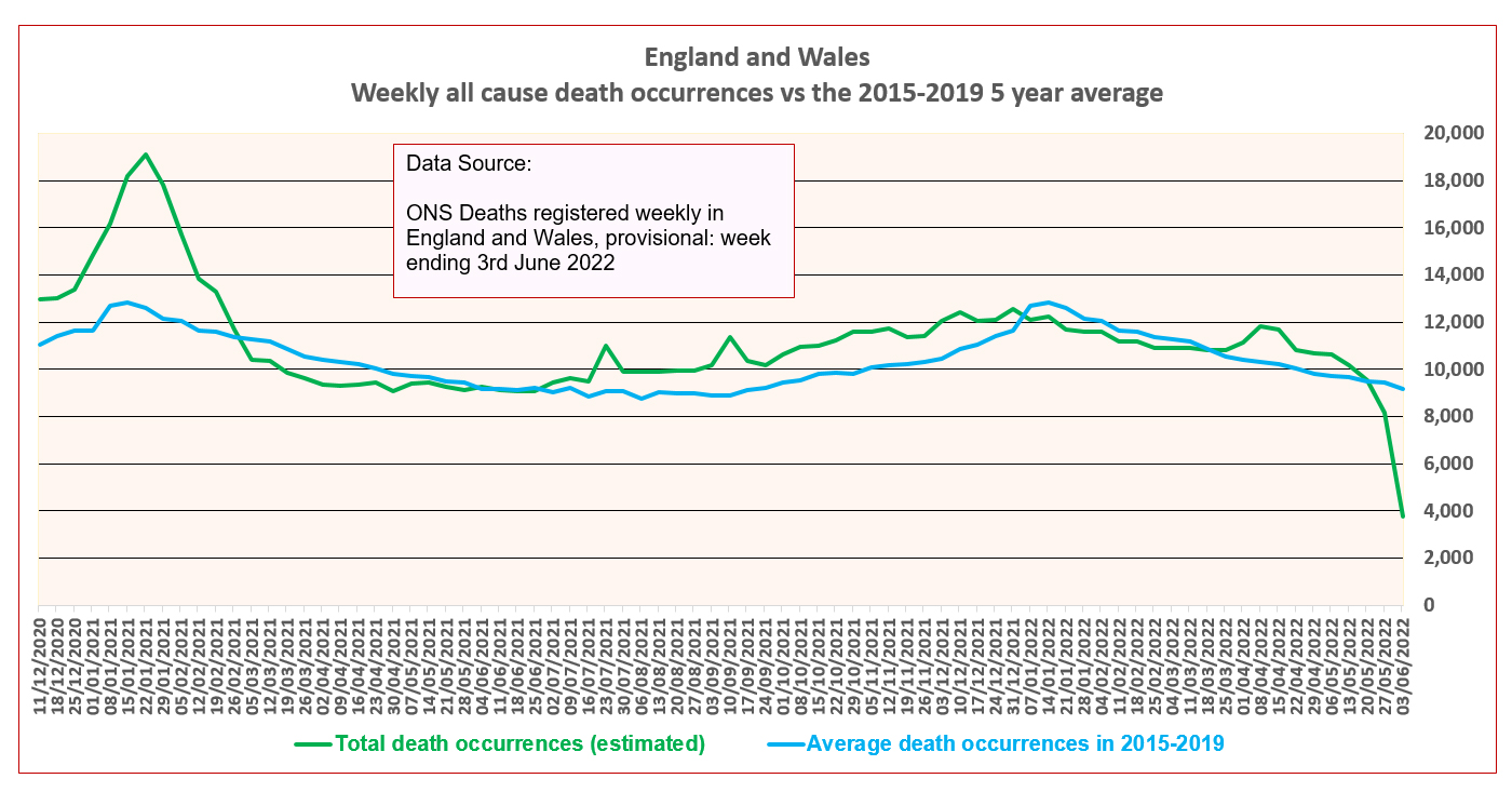 The weekly deaths by occurrence date shouldn’t have been massively affected, however ONS seem to have made an error in their estimates (see attached chart where you can see the completely implausible drop in the last week) so we will have to wait at least a week to see if all cause deaths are now falling below normal levels after the elevated period of all cause mortality coinciding with the Spring boosters.