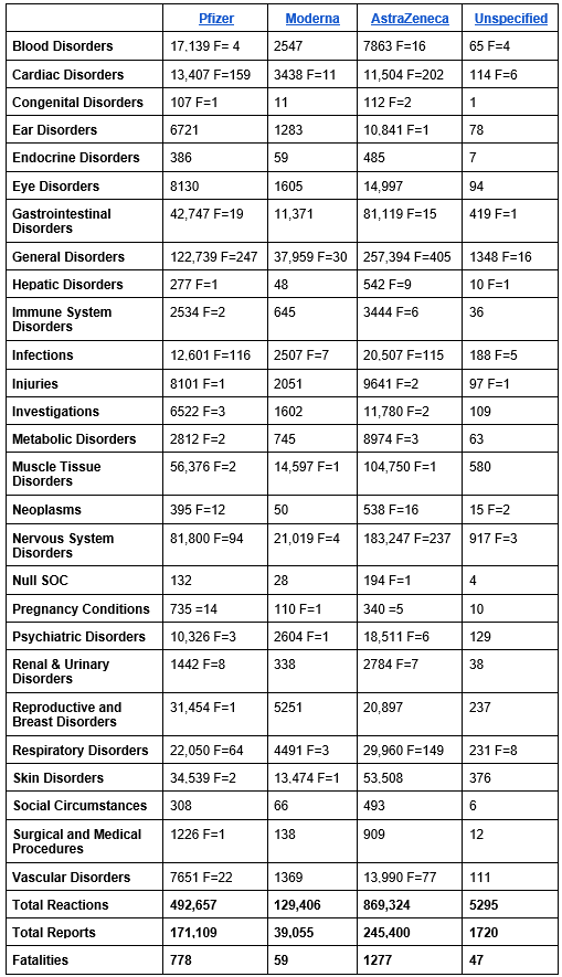 According to an updated report, as of May 25th the MHRA Yellow Card reporting system has recorded a total of 1,496,682 events based on 457,287 reports. The total number of fatalities reported is 2,161.