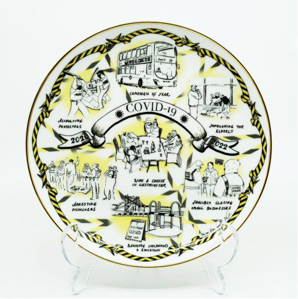 Now Miriam has produced the must-have sceptical souvenir of the pandemic: the COVID-19 commemorative plate. With a limited run of 200, the plate depicts touching moments from the lockdowns, such as the Imprisoning of the Elderly, the Arresting of Picknickers and the Banning of Childhood. She writes: