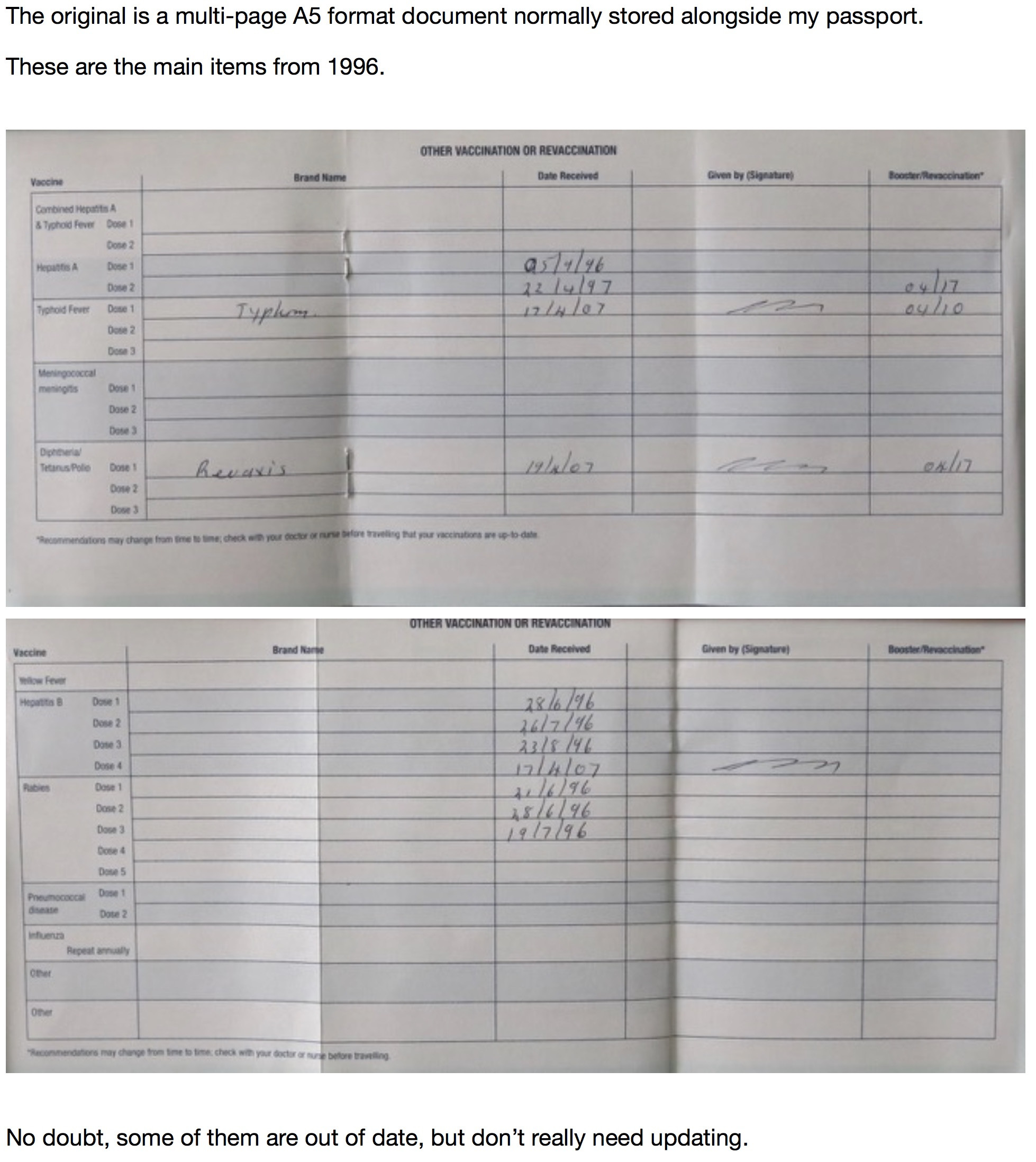 They might still be, but the jabs might have a ‘shelf life’. The last time I had one was in 2007 (with anti-Tetanus & Diphtheria in the same mixture), and the recommended duration was 10 years. When I had that it was for travel to Karachi in 2007, but I haven’t had it updated since 2007.