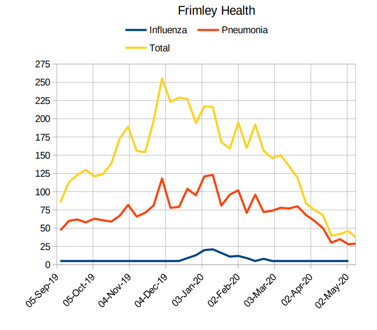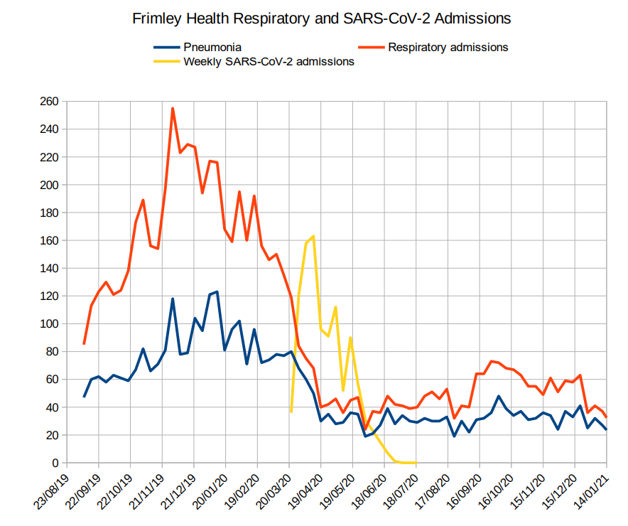 A graphical representation of the data from one trust, Frimley Health NHS Trust in Surrey, is shown below. The orange line represents all the patients admitted and diagnosed with any respiratory condition, the blue line is patients diagnosed with pneumonia, and the yellow line line is the number of patients with a positive SARS-CoV-2 test used as a proxy for COVID-19. When the medics in Wuhan first reported the outbreak they stated that there was pneumonia caused by an as yet unknown pathogen. The Frimley Health graph shows a steady increase in pneumonia diagnoses over the last quarter of 2019, before falling off in early 2020.