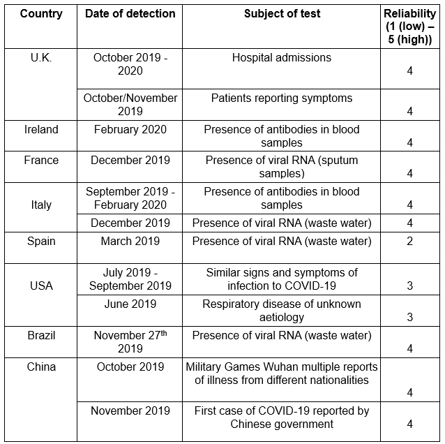 The following table summarises at a glance the information presented in this article. (N.B.: ‘Reliability’ in the right-hand column is an assessment of how likely the evidence is, in this author’s view, to show the presence of SARS-CoV-2.)