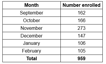 Apolone and colleagues in 2020 reported that between September 2019 and March 2020 in Italy, 959 patients were enrolled on a prospective lung screening trial that involved the taking of blood samples, with the monthly enrolment as shown below.
