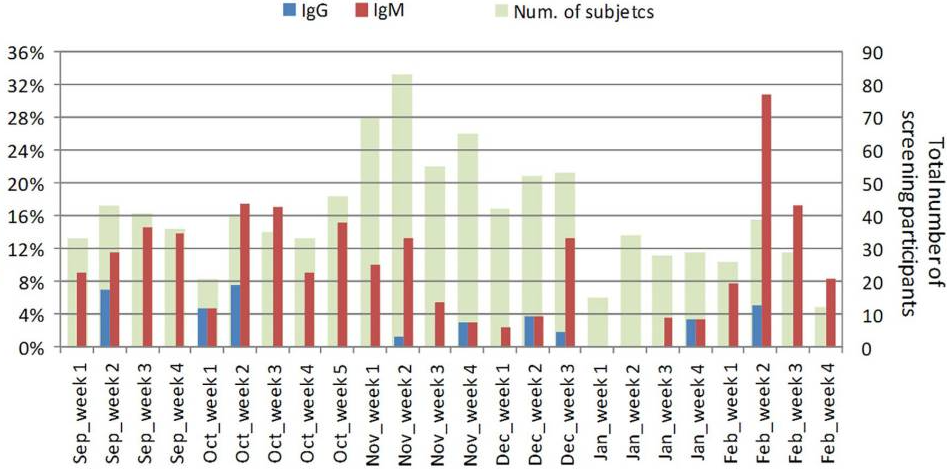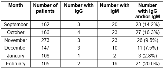 When the weekly data are examined, the researchers show that there are two distinct peaks, one in the second and third weeks of October (18% IgM positive) with the second occurring in the second week in February (30% IgM positive). Between these two dates the number of patients with IgG or IgM antibodies drops significantly.