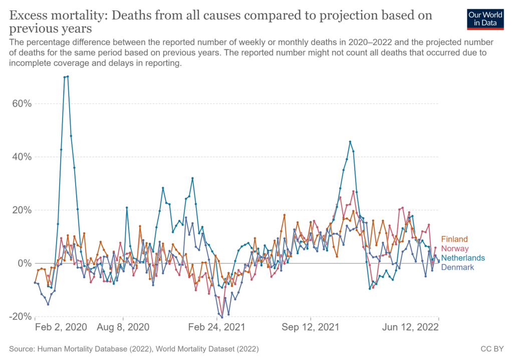 Northern European countries Finland, Norway, Denmark and the Netherlands had substantial excess deaths since mid-2021. Not all the excess deaths are Covid deaths, but apart from Denmark, these countries experienced significant excess deaths during the Omicron waves.